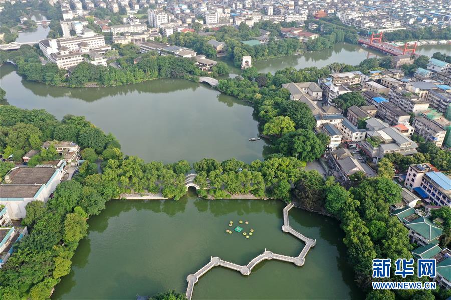 桂林市榕湖附近景觀(7月1日無人機拍攝)。 夏日時節,廣西桂林市區內的榕湖、杉湖、桂湖、木龍湖等地綠樹成蔭、景色迷人。 新華社記者陸波岸攝