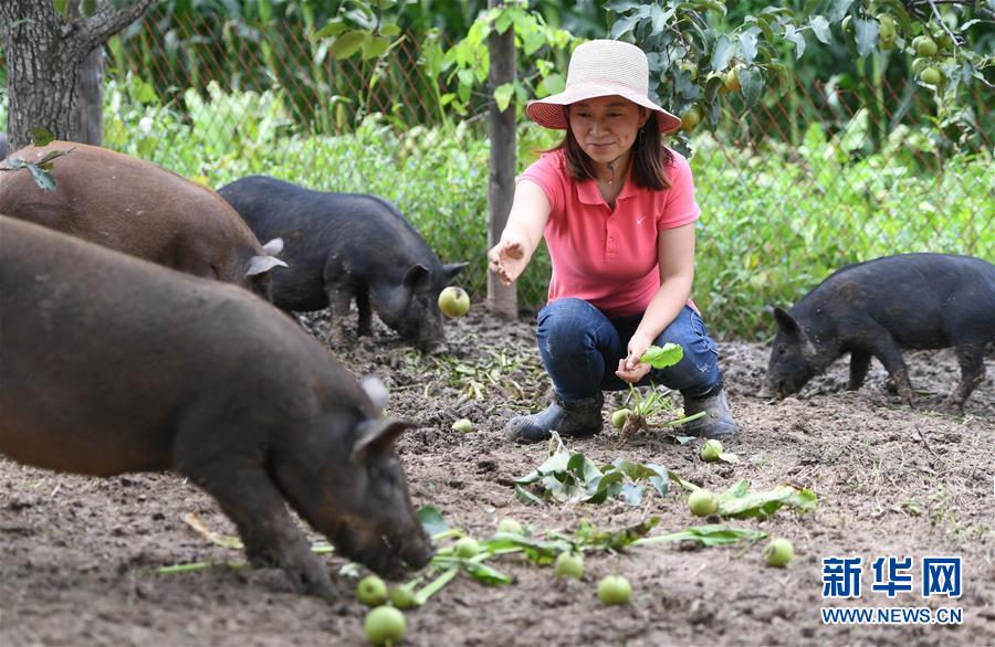 8月20日,康丹丹在果園內喂豬吃蘋果梨。新華社記者 王昊飛 攝