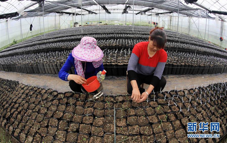 在廣西融安縣大良鎮古蘭村古蘭屯大棚基地,村民在嫁接金桔苗(4月12日攝)。 新華社記者 黃孝邦 攝