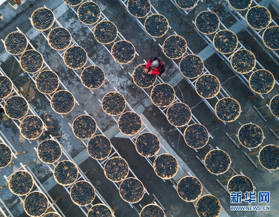 在福建省永春縣岵山鎮茂霞村熟地文創園,村民在晾曬用當地傳統手藝制作的藥材——熟地(1月28日無人機拍攝)。 新華社記者 宋為偉 攝