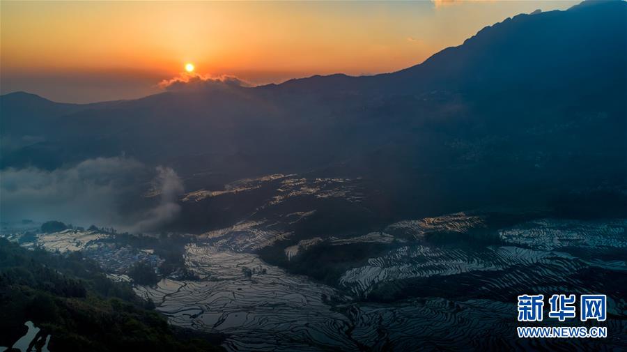 在云南省元陽(yáng)縣拍攝的晨曦中的哈尼梯田(4月4日無(wú)人機(jī)拍攝)。 新華社記者胡超攝