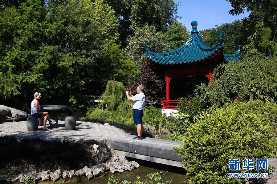 8月24日,在比利時布呂熱萊特市,游客在天堂動物園的“中國園”拍照留念。新華社記者 鄭煥松 攝