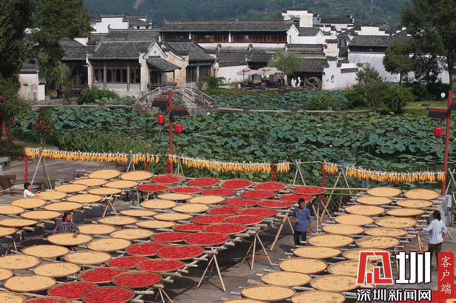 秋天,是收獲的季節。安徽省黃山市呈坎古村村民將收獲歸倉的玉米、黃豆、紅辣椒等農作物果實因地制宜晾曬,在古村曬場上描繪出一幅豐收曬秋圖。