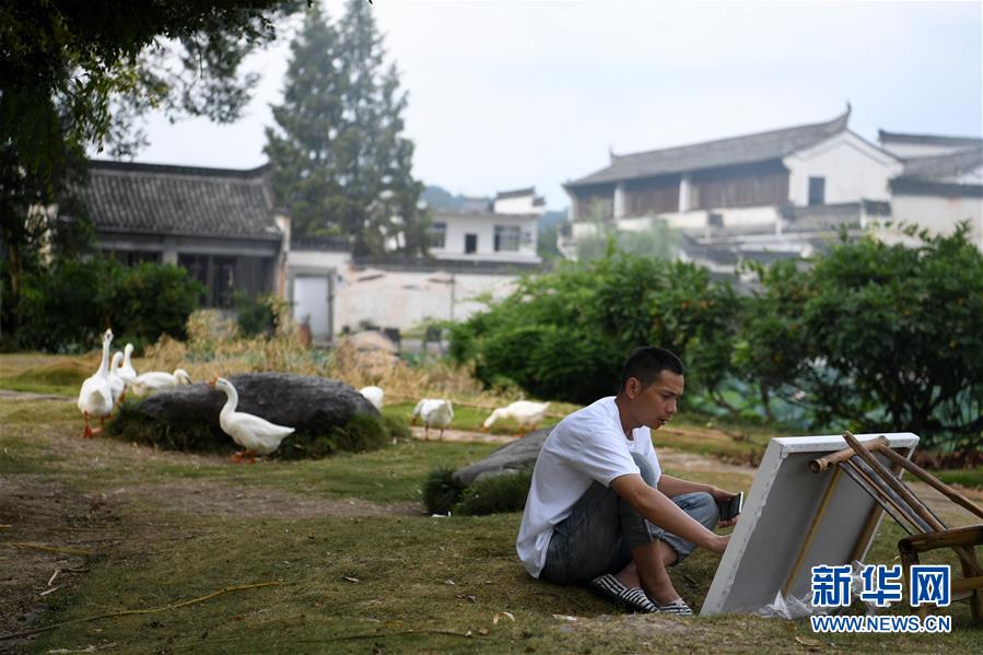 游客在呈坎村內寫生(8月28日攝)。新華社記者劉軍喜攝