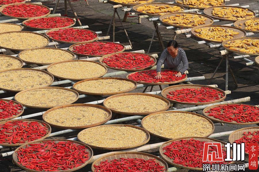 2019年9月9日,安徽黃山,呈坎古村村民在曬場上晾曬農作物。