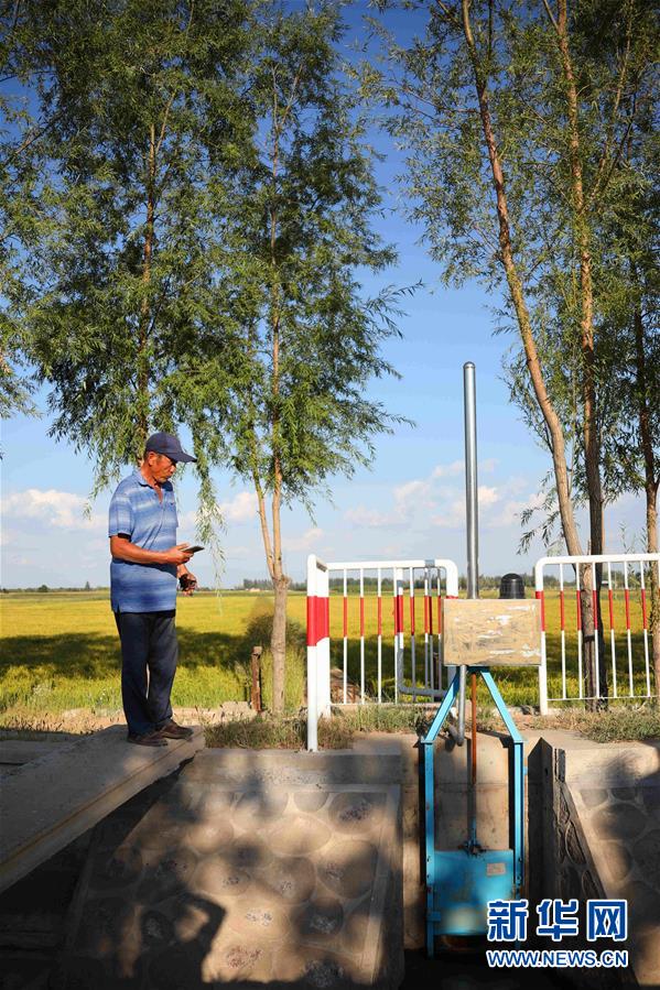 銀川市賀蘭縣常信鄉潭渠村村民用水協會會長孫萬銀輕點手機,灌溉支渠上的水閘緩緩升起(9月1日攝)。新華社記者劉詩平攝