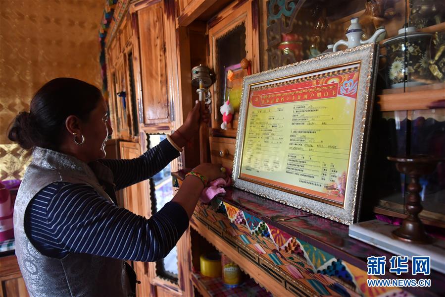 在青海省玉樹藏族自治州治多縣治渠鄉同卡村,村民昂文西讓的妻子布沙措江卓瑪清理家里的柜子(9月12日攝)。新華社記者 孫瑞博 攝