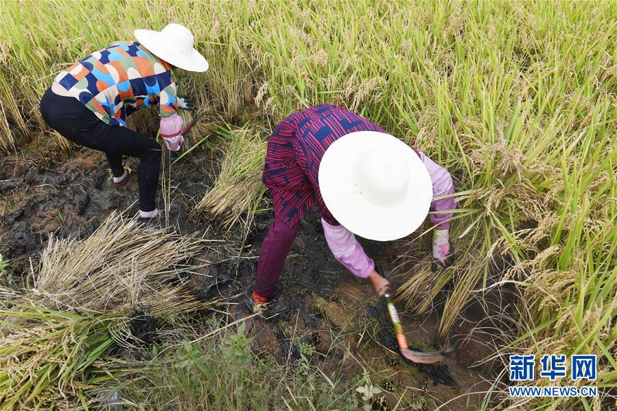 9月15日,云南尋甸回族彝族自治縣七星鎮魯古村的農婦在參加割稻谷比賽。 新華社記者 楊宗友 攝