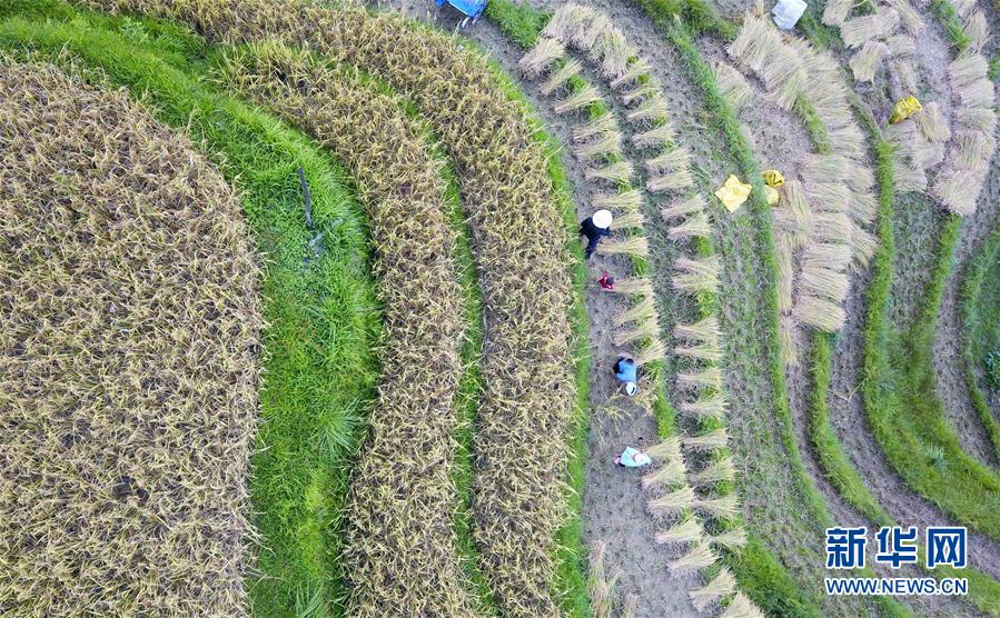 9月17日,貴州省榕江縣計劃鄉計劃村陽開苗寨的村民在收割稻谷(無人機拍攝)。新華社記者 楊文斌 攝