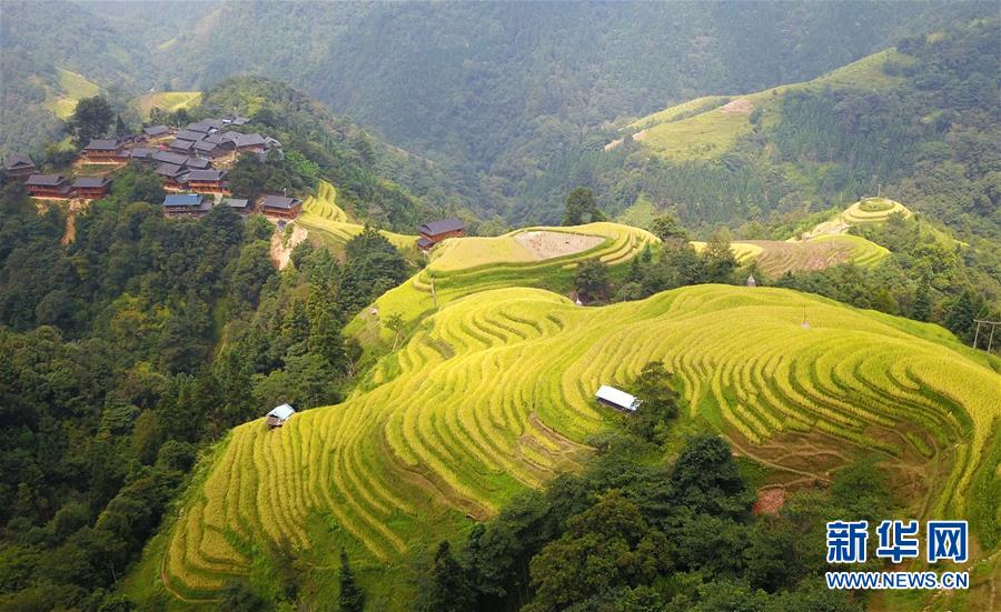 這是9月17日無人機拍攝的貴州省榕江縣計劃鄉計劃村陽開苗寨梯田。 近日,貴州省黔東南苗族侗族自治州榕江縣計劃鄉計劃村陽開苗寨的水稻陸續成熟,農民們搶抓農時收割稻谷。從空中俯瞰,層層疊疊的梯田線條分明,與古樸的苗寨木樓相互映襯,美不勝收。 新華社記者 楊文斌 攝