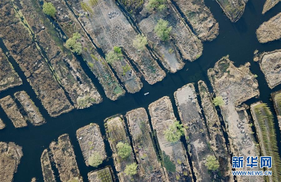 游船在白洋淀旅游碼頭內行駛(4月10日無人機拍攝)。新華社記者牟宇攝