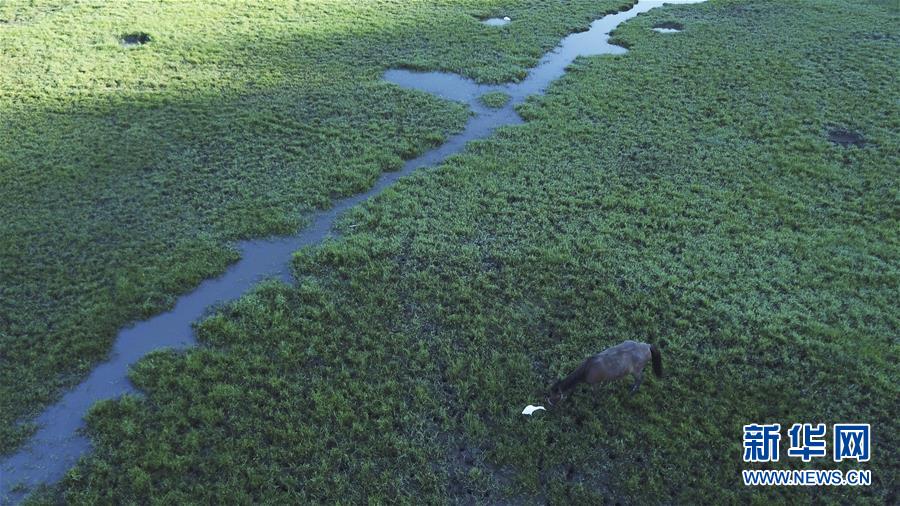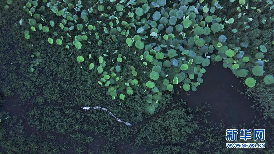 這是8月4日無人機拍攝的安徽黟縣宏村風景區附近的荷塘。新華社記者張端攝