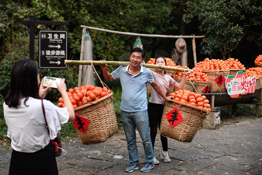 10月3日,游客在西溪國(guó)家濕地公園挑起道具“柿子”留影。據(jù)了解,西溪濕地內(nèi)共有柿子樹7000多棵,正值豐收的季節(jié)。 當(dāng)日是國(guó)慶假期第三天,大批游客來到位于杭州的西溪國(guó)家濕地公園游玩,在江南詩意的環(huán)境中休閑度假。 新華社記者 黃宗治 攝