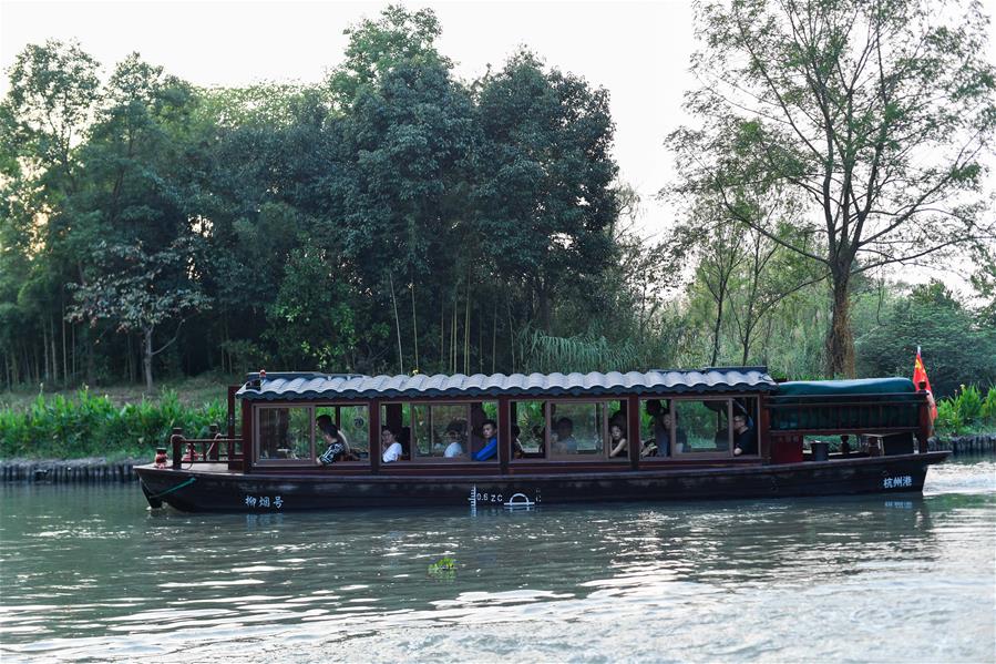 10月3日,游客在西溪國(guó)家濕地公園乘船游覽。 當(dāng)日是國(guó)慶假期第三天,大批游客來到位于杭州的西溪國(guó)家濕地公園游玩,在江南詩意的環(huán)境中休閑度假。 新華社記者 黃宗治 攝