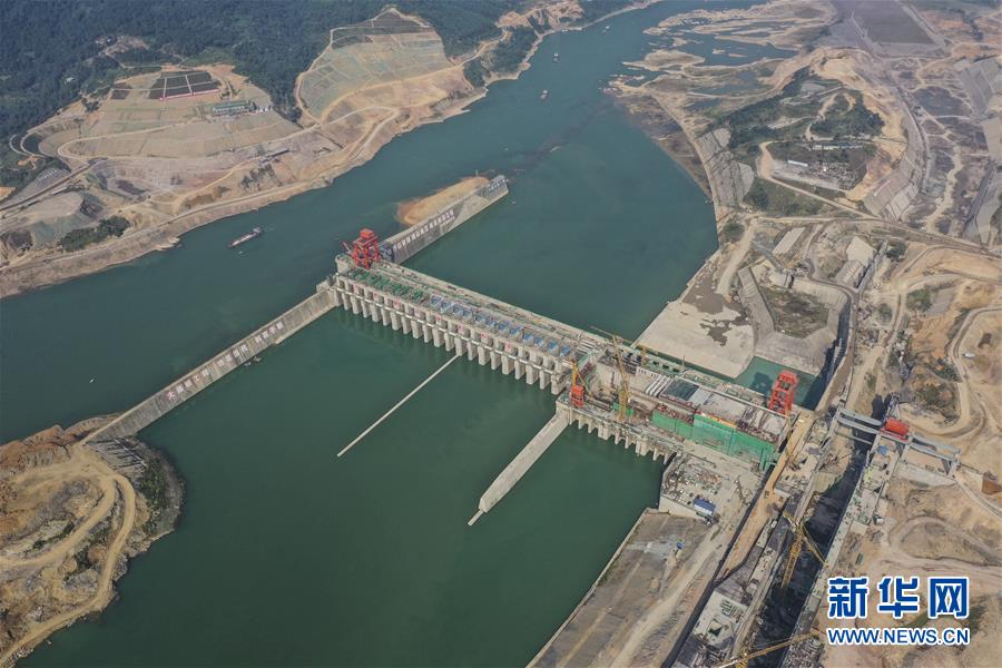 建設中的大藤峽水利樞紐工程(10月6日無人機拍攝)。節日期間,工人們在位于廣西桂平市西江流域黔江河段的大藤峽水利樞紐工程現場加緊施工。新華社記者曹祎銘攝