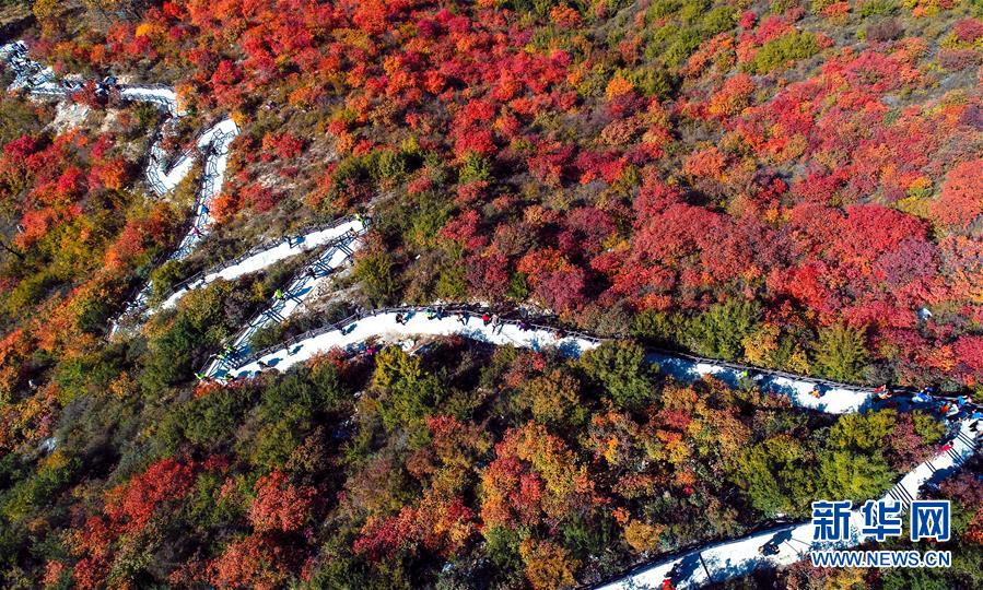 這是10月19日無人機拍攝的河北省涉縣太行紅葉大峽谷景色。金秋十月,河北省涉縣偏城鎮太行紅葉大峽谷的紅葉進入觀賞佳期,吸引眾多游客前來登山賞景。新華社記者王曉攝
