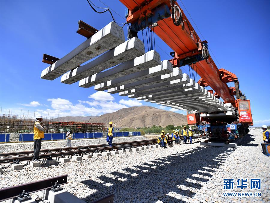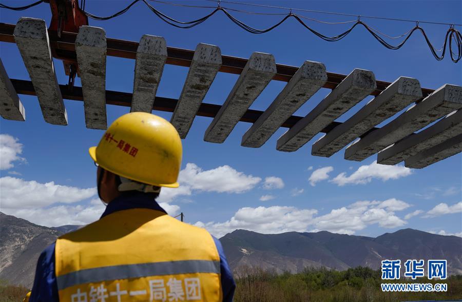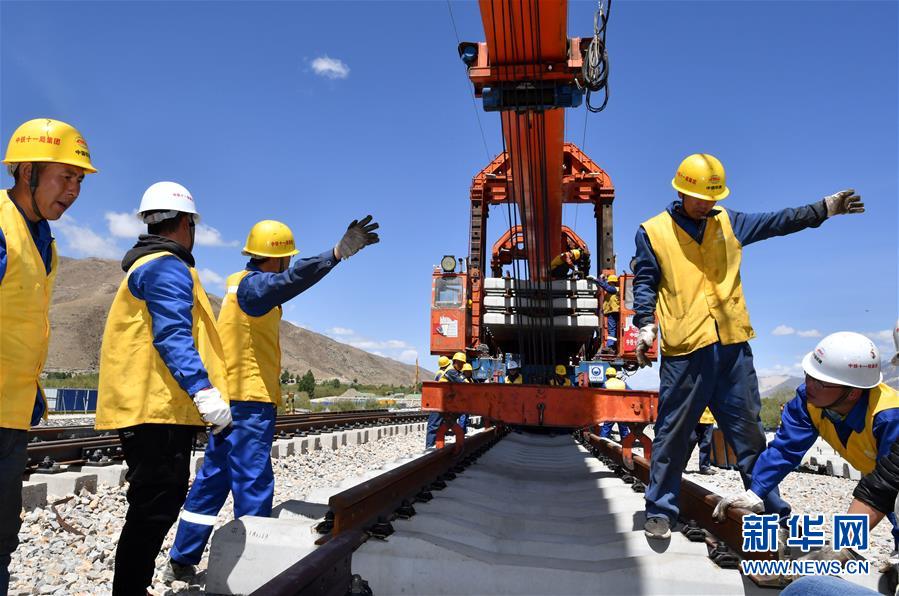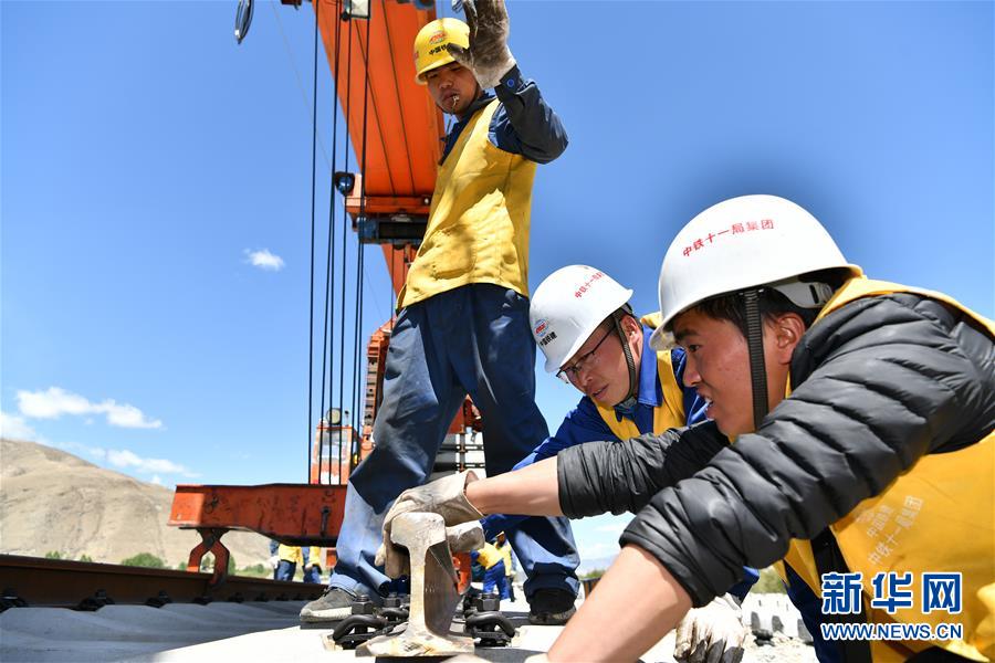 6月6日,負責鋪軌的中鐵十一局集團的建設者在現場作業。新華社記者普布扎西攝