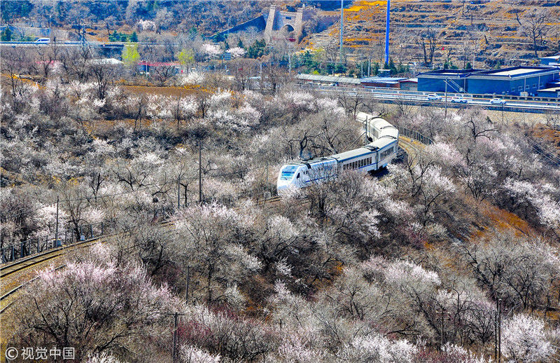 2019年3月22日,北京居庸關(guān)附近的山花盛開(kāi),S2線列車(chē)穿行在花海之中,構(gòu)成一幅美麗的畫(huà)面。