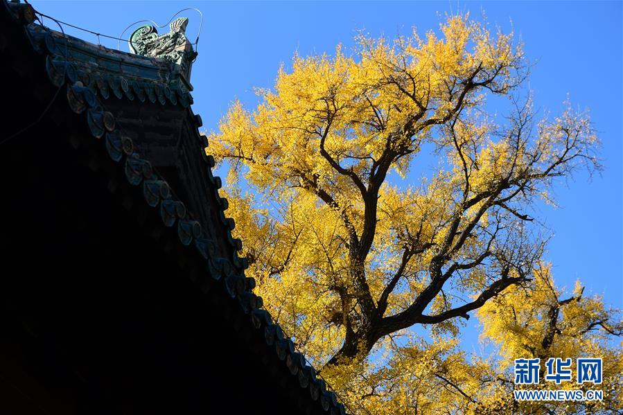 11月11日,大覺寺內的古銀杏與建筑相映成趣。新華社記者尹棟遜攝
