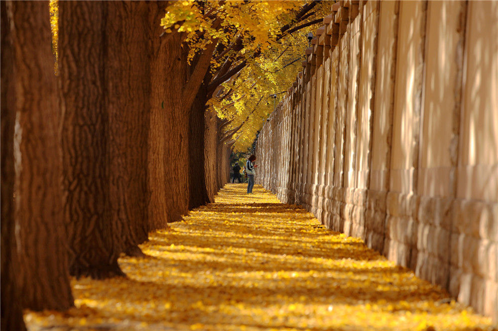 2019年11月11日,北京,西城區三里河數百米銀杏大道一片金黃,吸引眾多游人欣賞拍照。