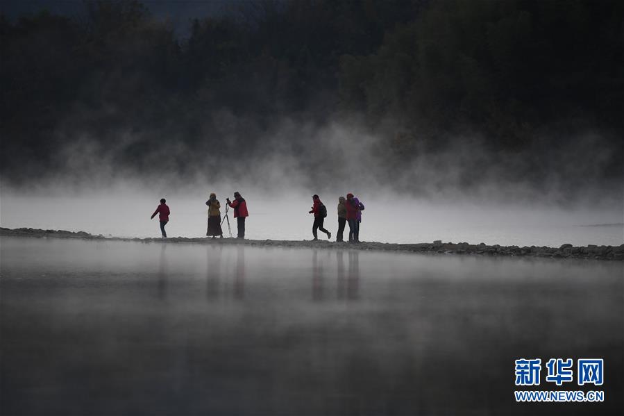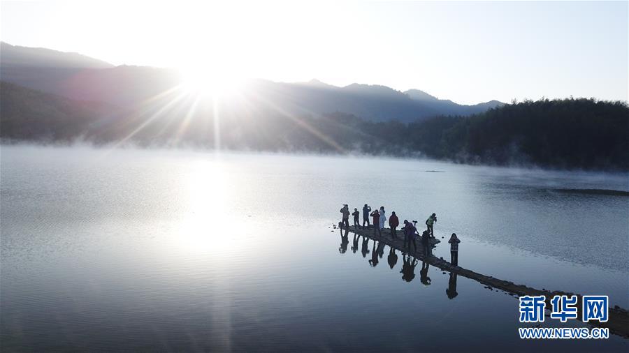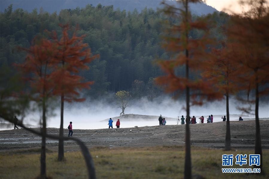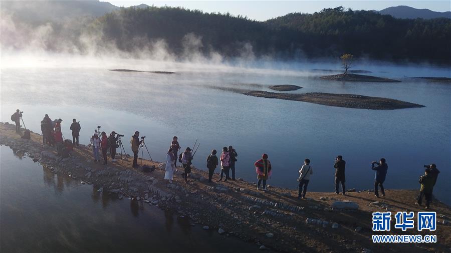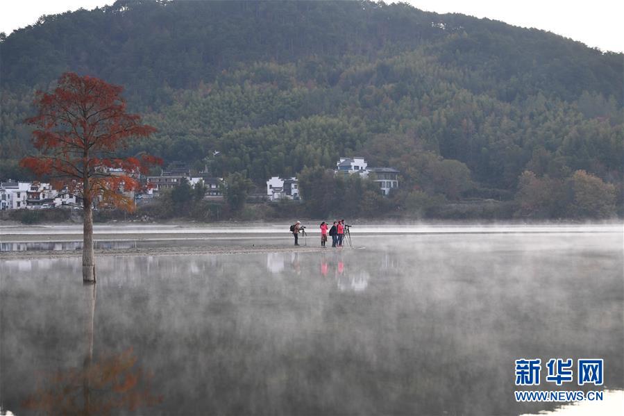 11月14日,游客在奇墅湖邊拍攝風光。 初冬時節,安徽省黃山市黟縣奇墅湖晨霧縹緲,別具韻味。新華社記者劉軍喜攝