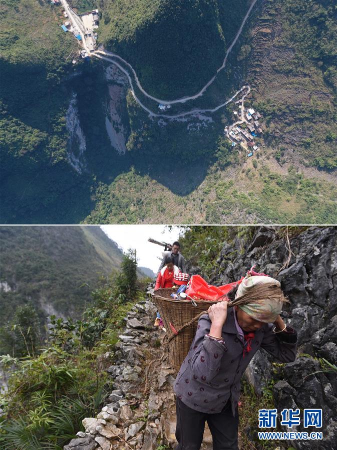 拼版照片:上圖為已經修通水泥路的大化瑤族自治縣板升鄉八好村八好屯(11月11日無人機拍攝);下圖為在尚未通路的八好村八好屯,村民背著年貨走山路回家(2016年1月26日攝)。新華社記者黃孝邦攝