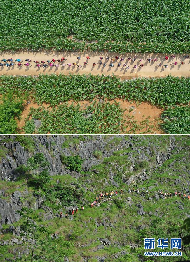拼版照片:上圖為在大化瑤族自治縣板升鄉弄勇村,孩子們走在放學路上(5月10日無人機拍攝);下圖為在弄勇村弄頂屯,孩子們扛著生活用具,走山路回家(2012年7月4日攝)。新華社記者黃孝邦攝