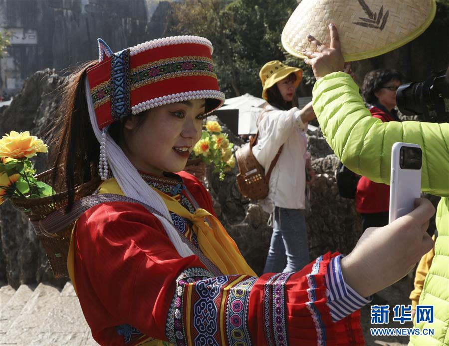 游客在石林景區身著民族服飾自拍(11月27日攝)。新華社記者蘭紅光攝