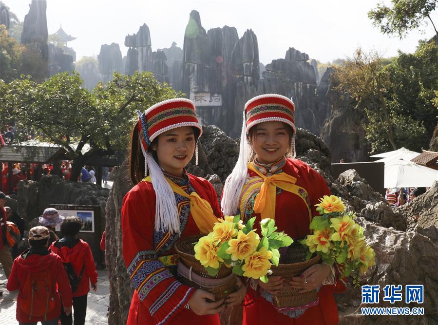 游客在石林景區身著民族服飾拍照留念(11月27日攝)。新華社記者蘭紅光攝