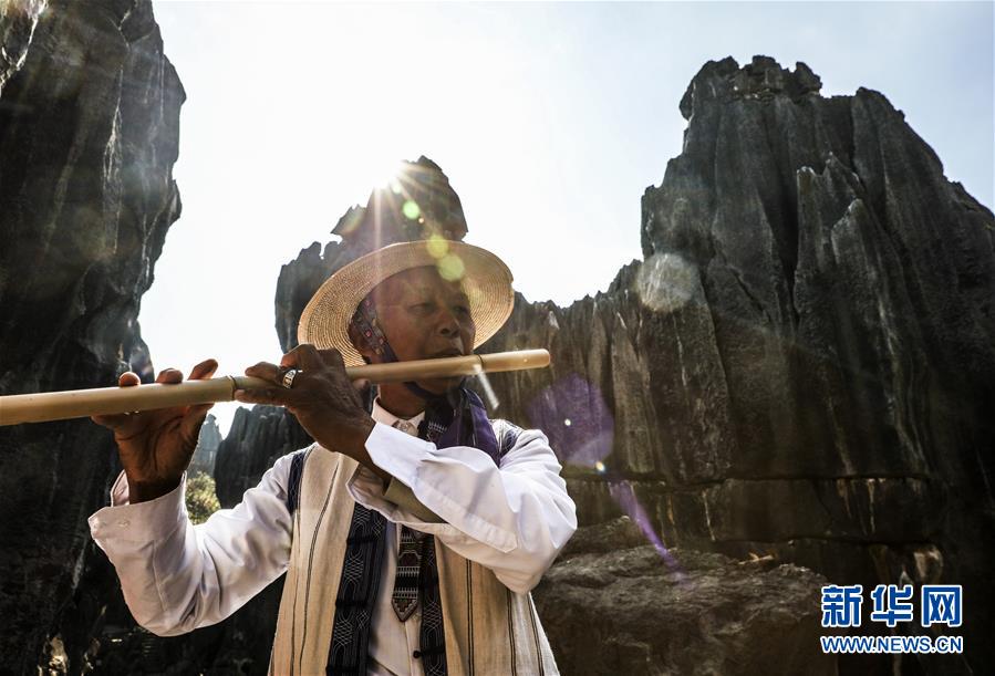 當地少數民族樂手在石林景區演奏民族音樂(11月27日攝)。新華社記者蘭紅光攝