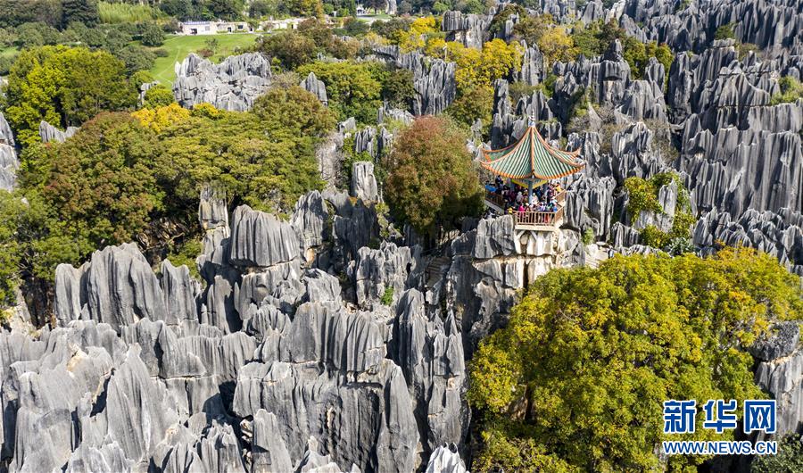 11月28日,游客在石林景區游覽(無人機拍攝)。新華社記者江文耀攝