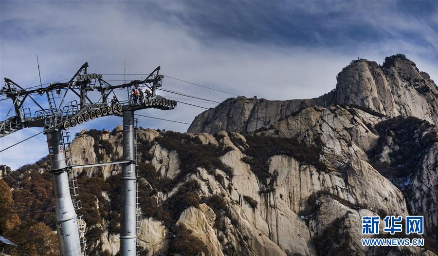 華山太華索道維修人員在進(jìn)行索道支架橫擔(dān)檢測(cè)(12月5日無人機(jī)拍攝)。新華社記者陶明攝