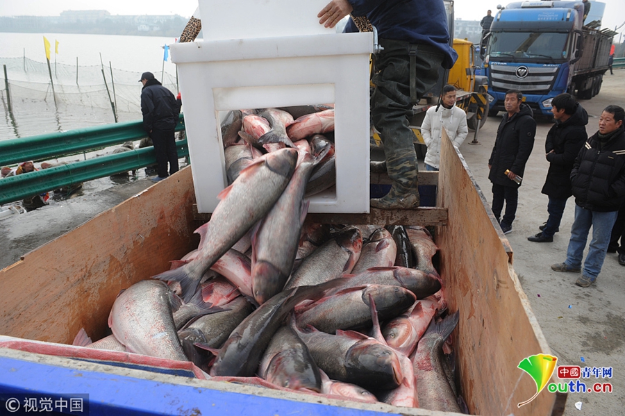 八里河冬捕與其他地方的捕魚方式不同,漁民們提前一個月的時間駕駛小船,自東向西驅逐魚群,漸漸地會把近兩萬畝水面的魚群都聚攏到碼頭附近一百多畝用圍網柵起來的區域。據當地漁場負責人介紹“為了賣出好價格,今年與往年一樣,先根據市場行情確定底價,然后通過招投標方式確定銷售商。”今年,為了吸引更多的人們來八里河參與冬捕活動,八里河漁場在活動當天會拿出3萬斤鮮魚供市民選購。
