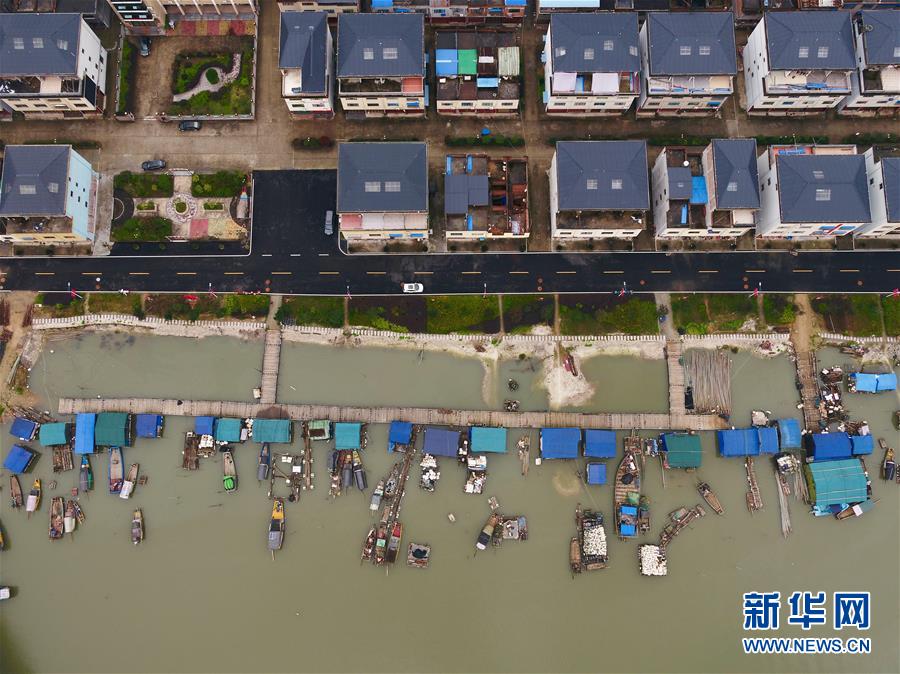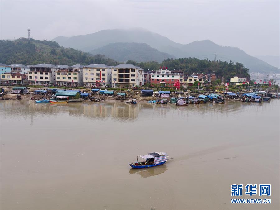 在寧德福安市溪邳村,一艘漁船經過岸上新居(3月8日無人機拍攝)。新華社記者姜克紅攝