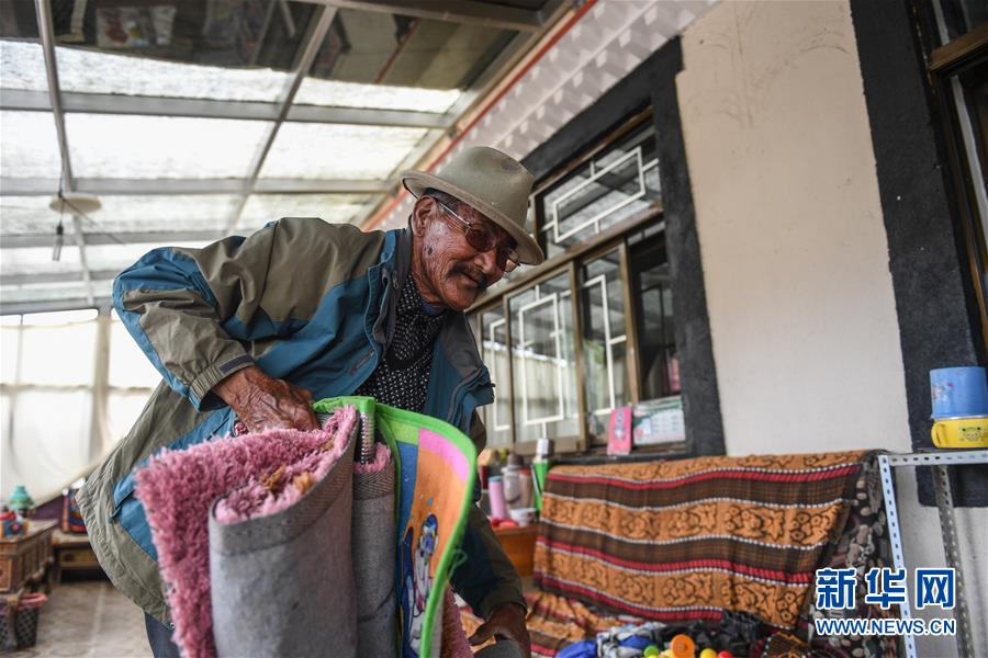 在西藏阿里地區札達縣托林鎮札布讓村,76歲的達瓦次仁在整理家庭旅館的床墊(7月30日攝)。新華社記者晉美多吉攝