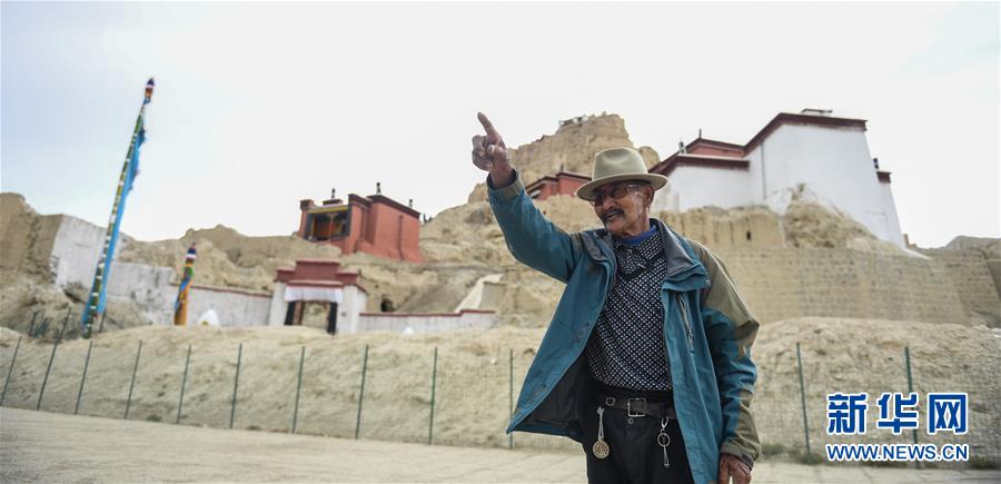 達瓦次仁和他曾經居住的、位于古格遺址前的家(7月30日攝)。新華社記者晉美多吉攝