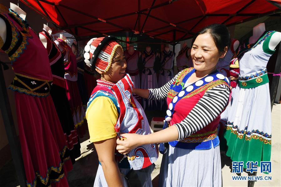 11月2日,云南福貢縣鹿馬登鄉干布村的傈僳族婦女阿白(右)在展示自己手工制作的服飾。阿白靠傳統服飾制作每年可收入三萬多元。新華社記者楊宗友攝