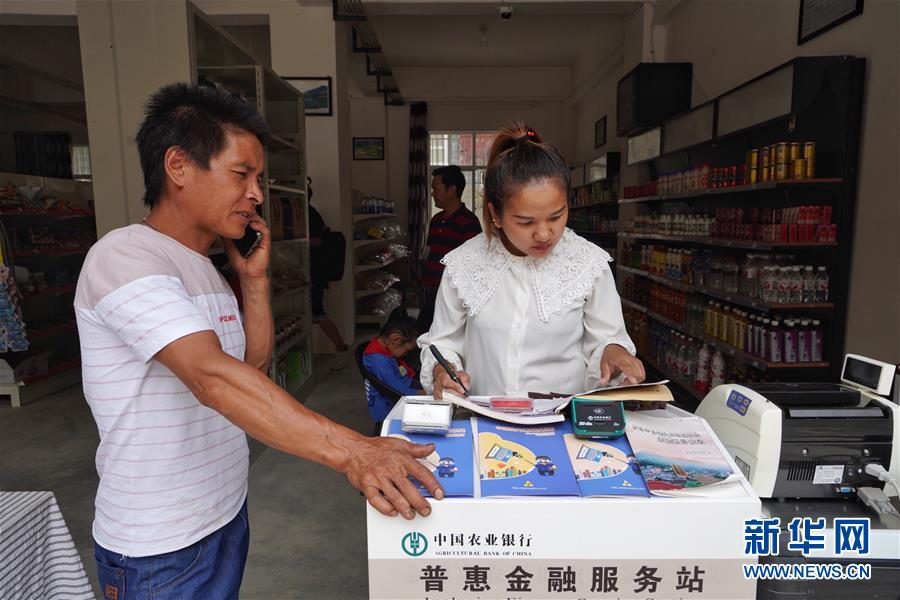 在大興地鎮維拉壩“珠海小區”金融服務站,姬紅花(右)幫助村民提取現金(6月24日攝)。新華社記者秦晴攝