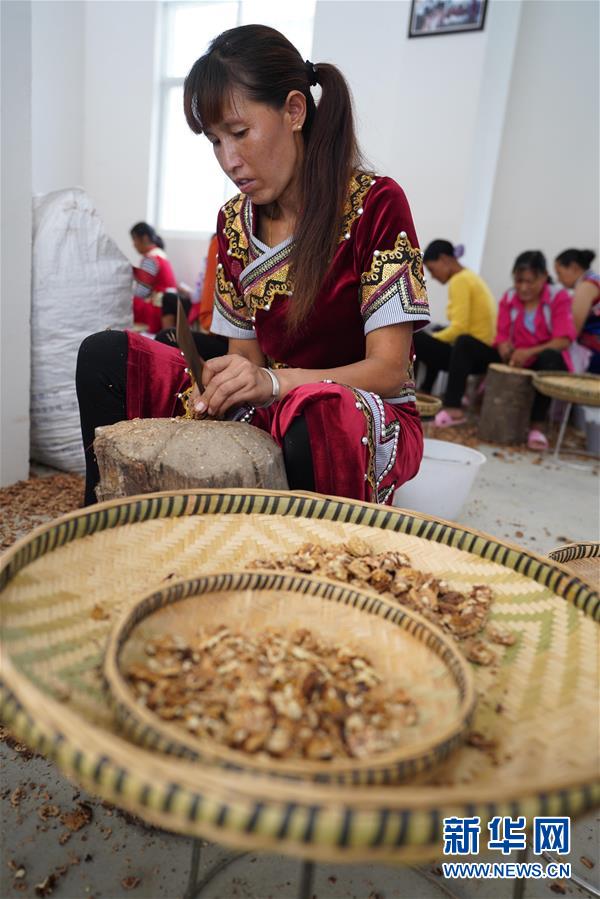 在大興地鎮維拉壩“珠海小區”內的農產品加工扶貧車間,村民李南珍在剝核桃仁(6月24日攝)。新華社記者秦晴攝