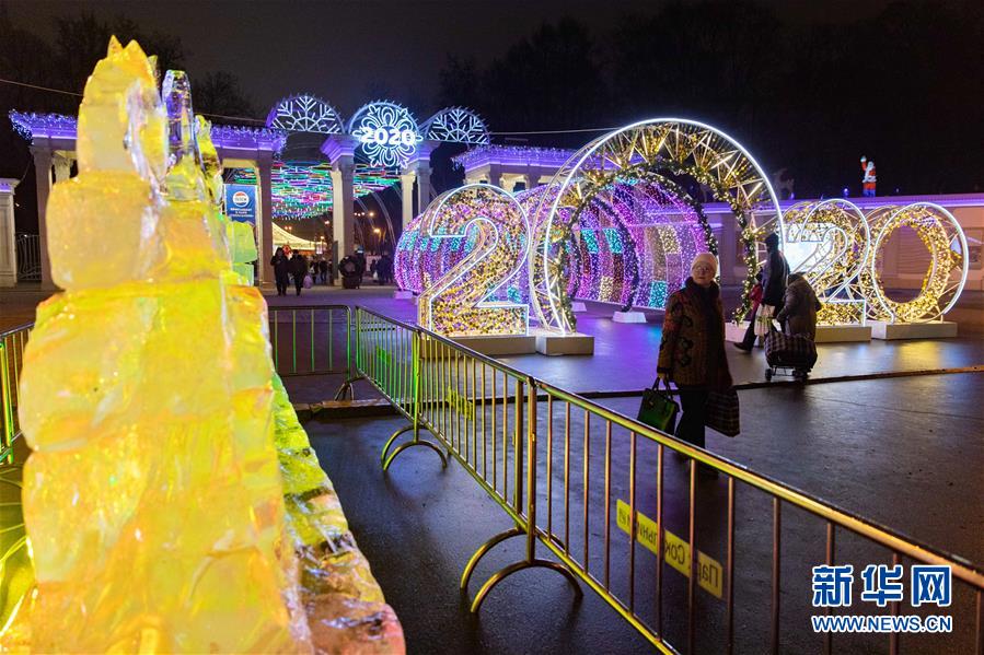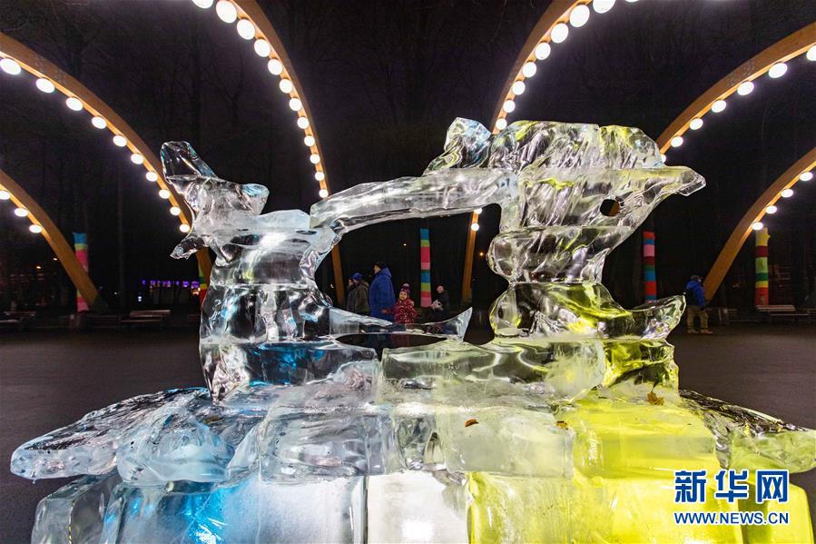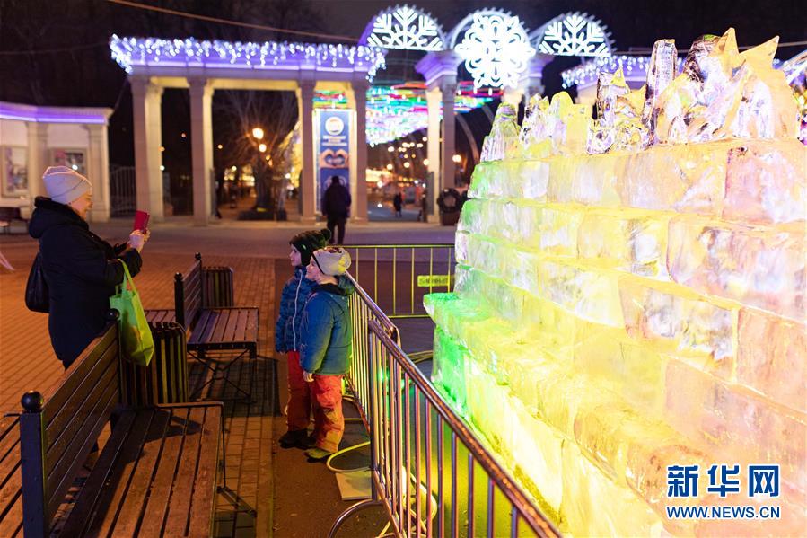 12月24日,在俄羅斯首都莫斯科,人們參觀冰雕藝術展。 新華社記者 白雪騏 攝