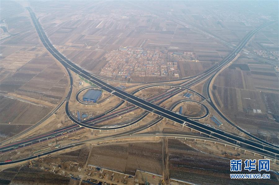 這是1月3日拍攝的北京大興國(guó)際機(jī)場(chǎng)北線高速公路廊坊段王場(chǎng)互通樞紐(無(wú)人機(jī)照片)。