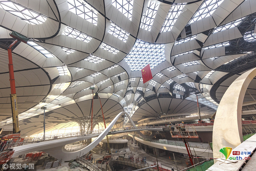 2018年12月19日,北京大興國(guó)際機(jī)場(chǎng)航站樓的室內(nèi)裝修正在推進(jìn)中。視覺中國(guó)
