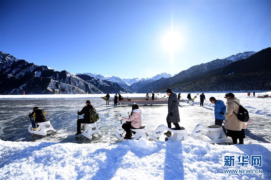 1月18日,游客在新疆天池景區玩冰上爬犁。新華社記者 沙達提 攝
