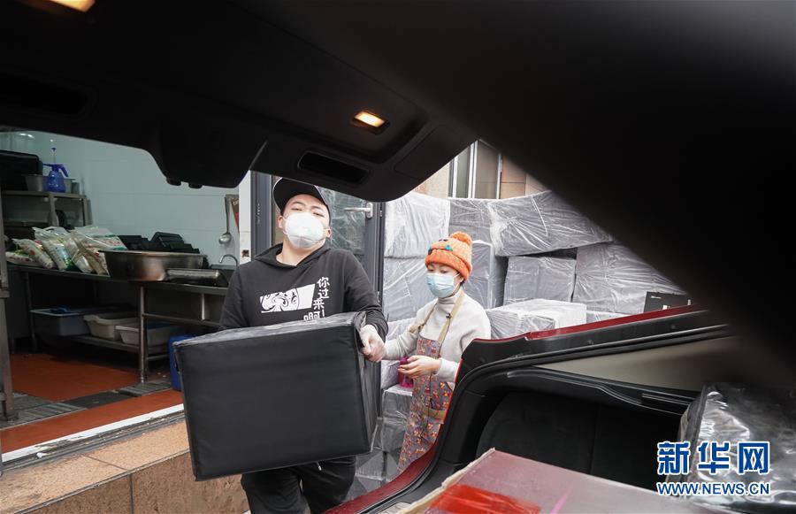 2月26日,劉女士(右)和伙計把裝滿盒飯的保溫箱搬上車。新華社記者程敏攝