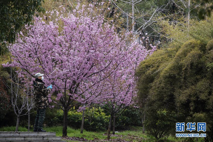 3月3日,一名工作人員在觀賞盛開的櫻花。 新華社記者 費茂華 攝