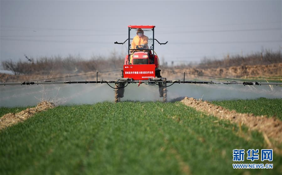 3月4日,建建農機合作社社員在蒲城縣椿林鎮平峨村駕駛自走式高桿噴霧機為小麥噴灑除草殺菌劑。近日,為確保疫情期間不誤農時,陜西省蒲城縣植保植檢站組織縣內7家農作物病蟲害專業化防治單位,在小麥返青起身期,對麥田進行除草及病蟲害的防控工作。新華社記者李一博攝