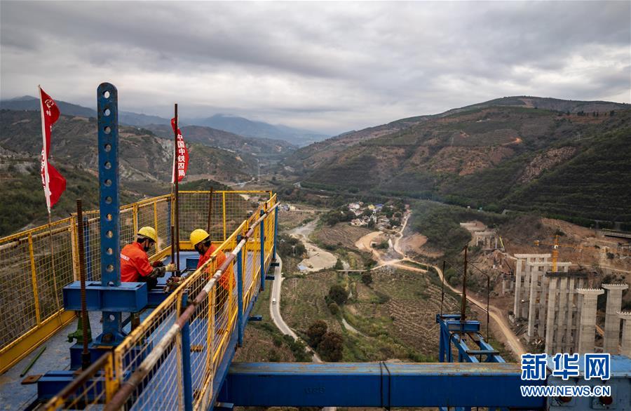 3月5日,工人在中老鐵路南溪河特大橋上施工。近期,中老鐵路玉溪至磨憨段有序復工復產,由中鐵四局承建的中老鐵路全線重點控制性工程——元江特大橋、南溪河特大橋正在加緊施工建設。新華社記者 江文耀 攝