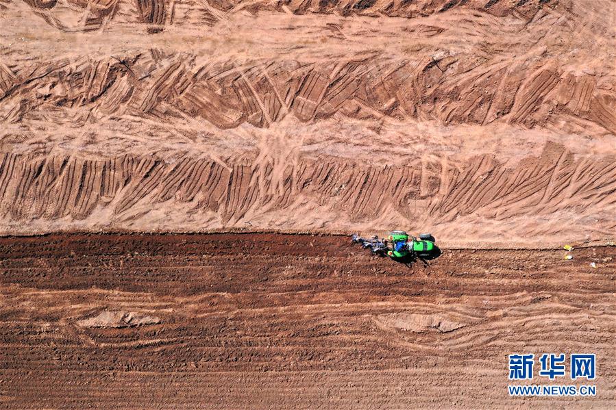3月18日,在中國鐵路太原局集團有限公司新創(chuàng)云竹生態(tài)農業(yè)園,農民在用農機犁地(無人機照片)。新華社記者 曹陽 攝