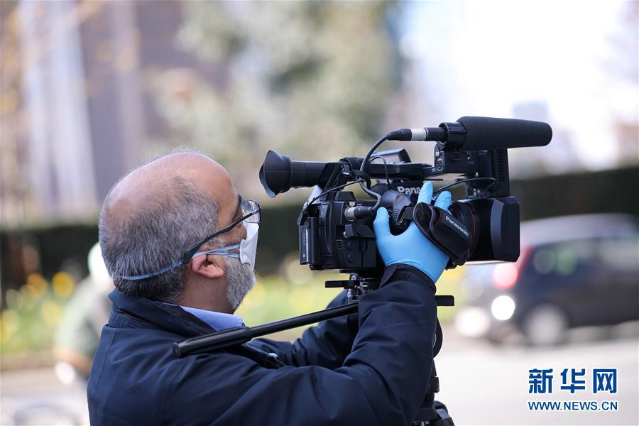 3月18日,在比利時布魯塞爾,一名佩戴口罩的記者在街頭采訪。 新華社記者 張鋮 攝