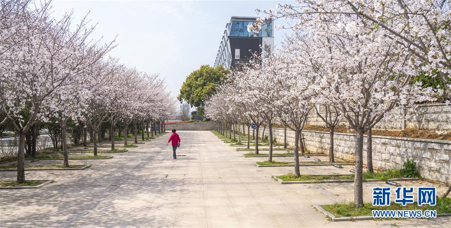 3月19日,在武漢市武昌區被網友稱為“武漢最美停車場”的湖北日報停車場,一名工作人員從櫻花樹邊經過。 新華社記者 才揚 攝